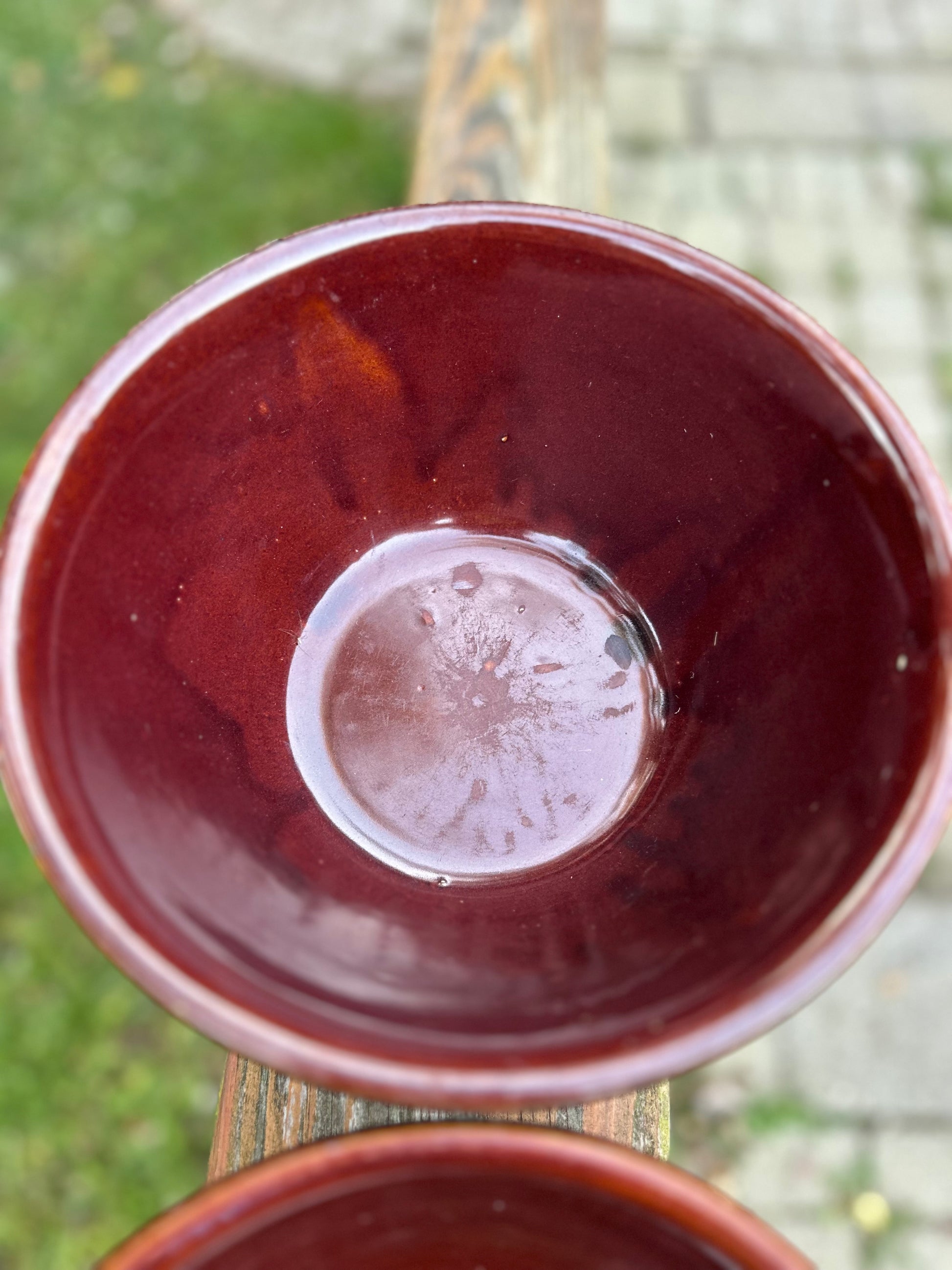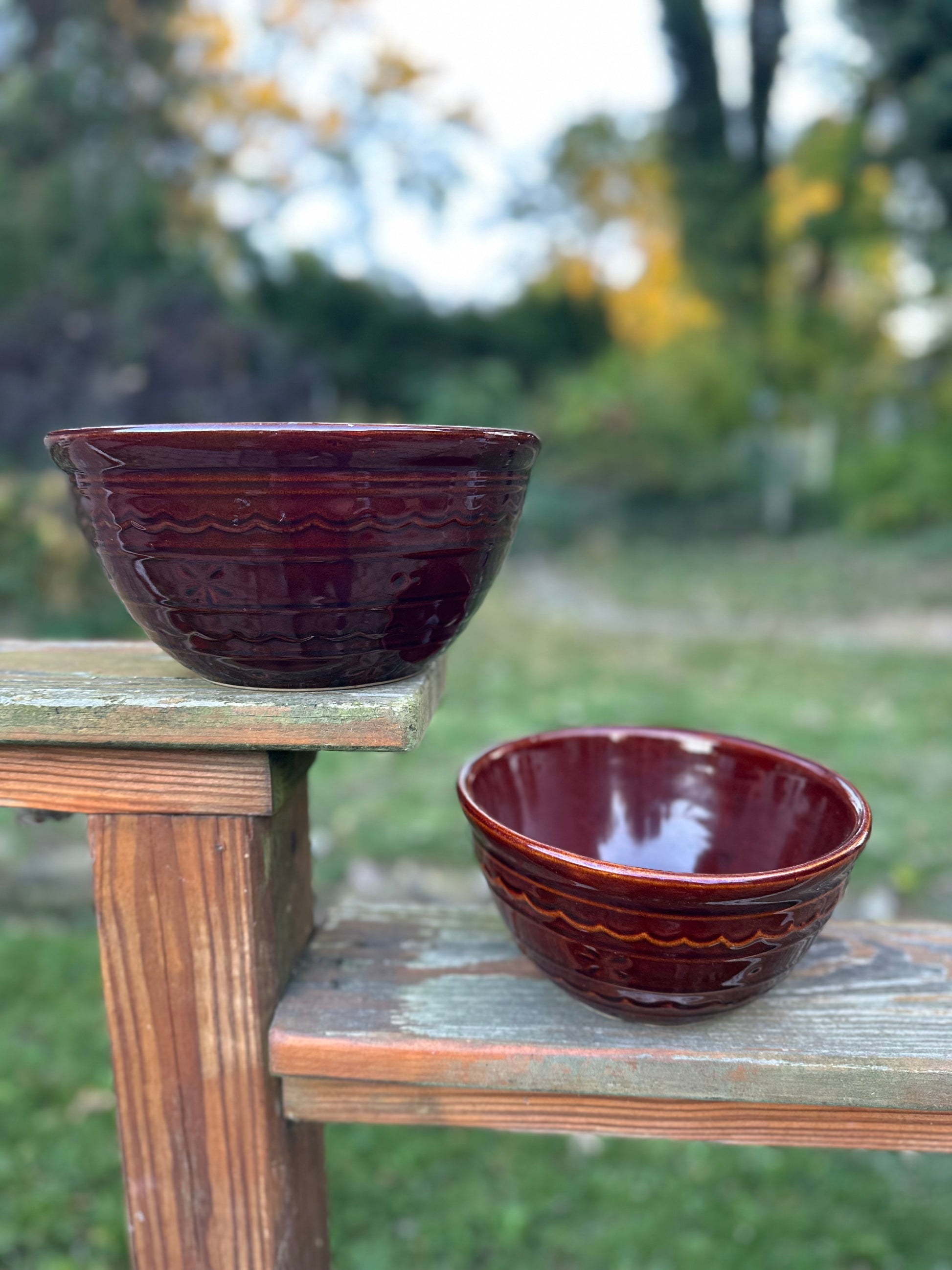 Set of two, Marcrest Daisy Dot stoneware mixing bowls. The larger bowl measures 9 inches across and 4.5 inches tall. The smaller bowl is 8 inches across and 4.25 inches tall. Beautiful glazed stoneware pieces - perfect for fall decorating!