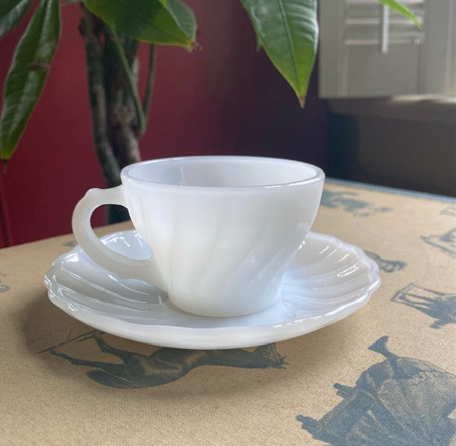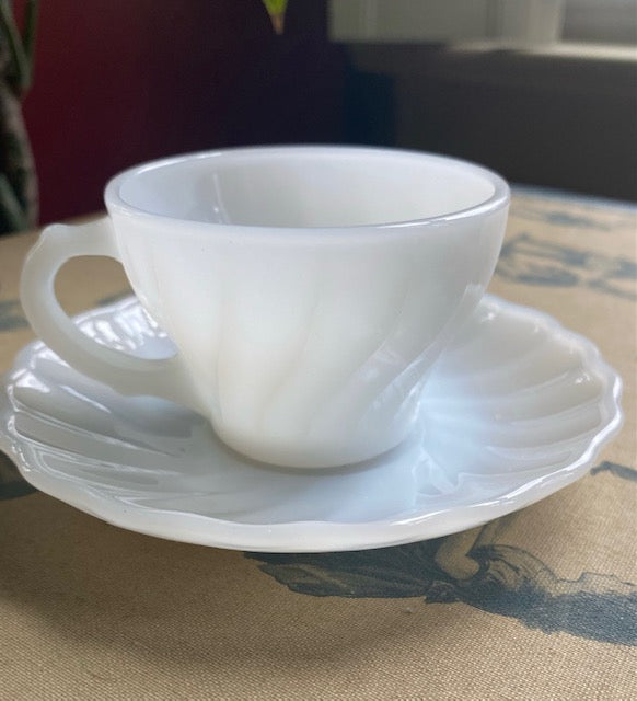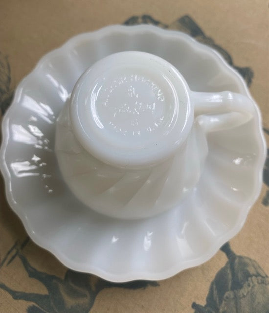 Beautiful teacup and saucer in the white swirl opalescent pattern for Anchor Hocking's Fire King line. No chips or cracks. Each saucer measures 4.75 inches across. Teacup measures 2.75 inches across and 2 inches tall.