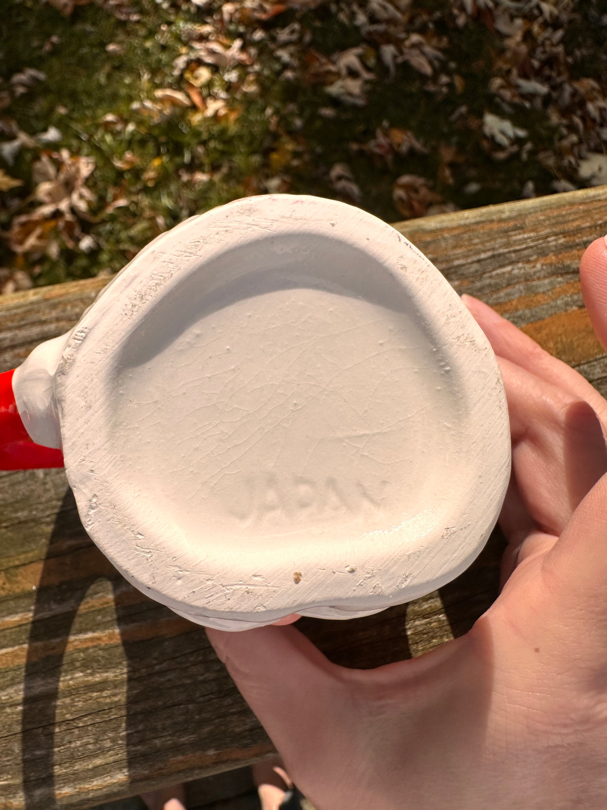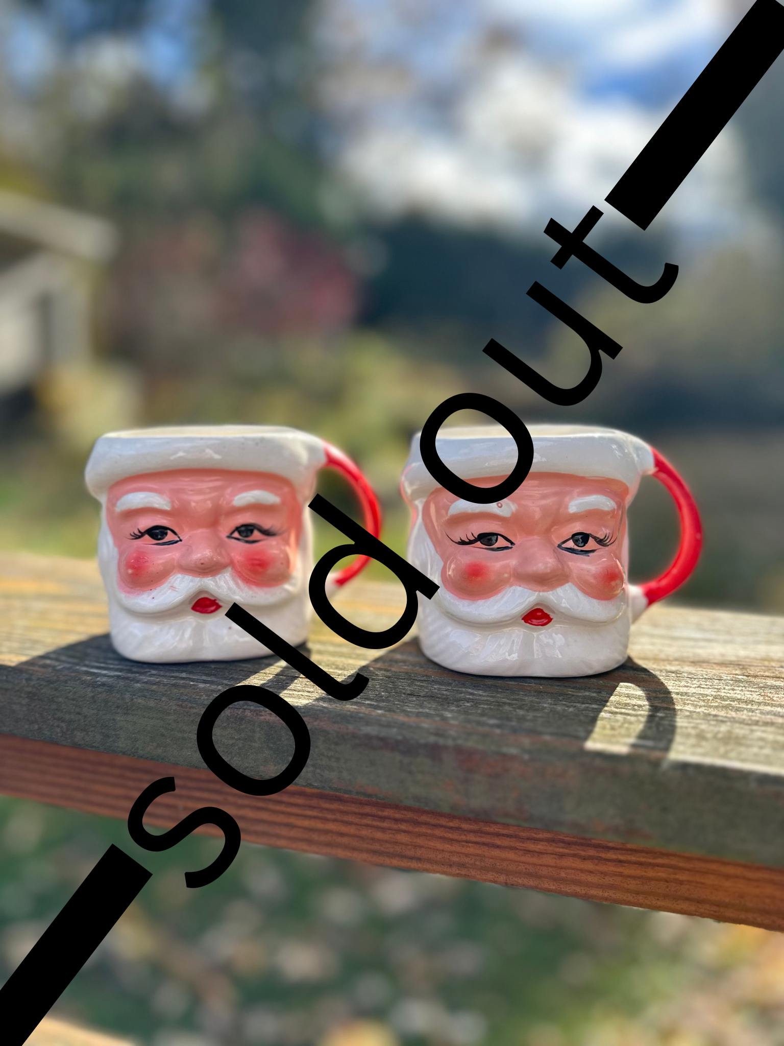 Whimsical Santa mugs are so much fun! This Santa mug is in great condition! There is a flake of paint missing here or there but no chips or cracks. Mug measure 3 inches tall and 3 inches across. Made in Japan. One available.