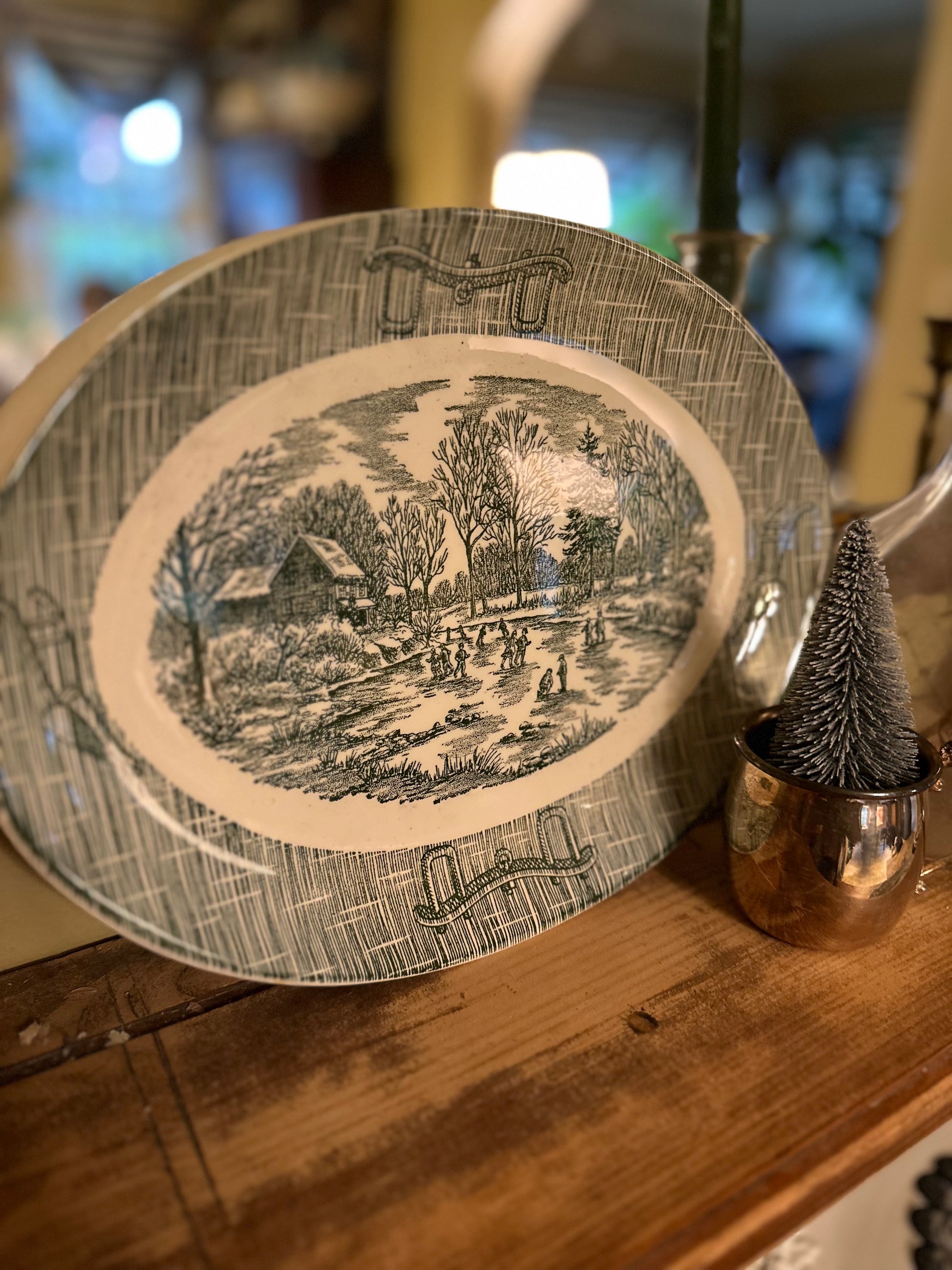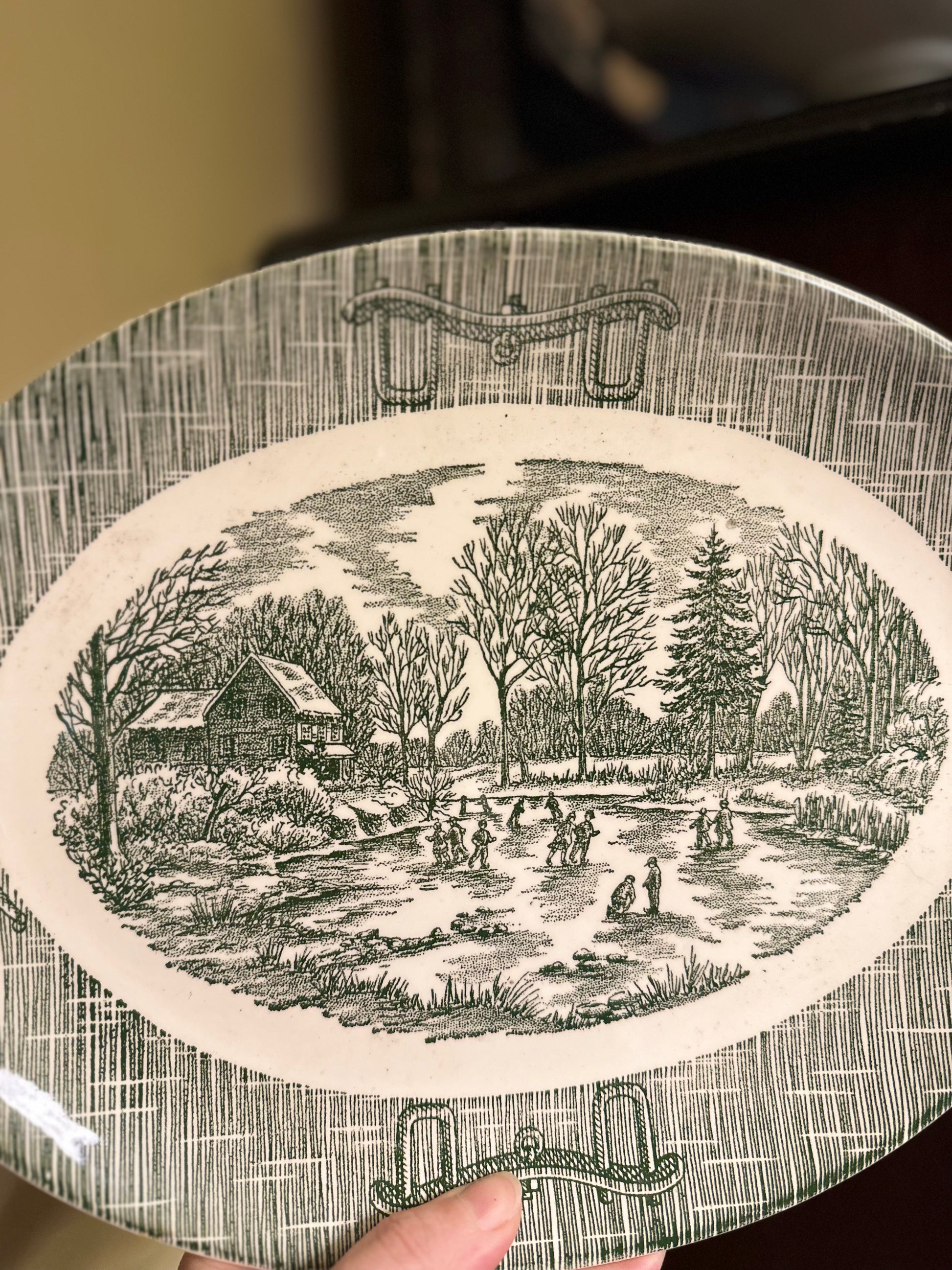 This beautiful platter features a quaint Currier & Ives scene of couples skating on a frozen pond. The pattern is dark green on a creamy white background. The serving platter measures 12 inches long and 9 inches across. No chips or cracks!